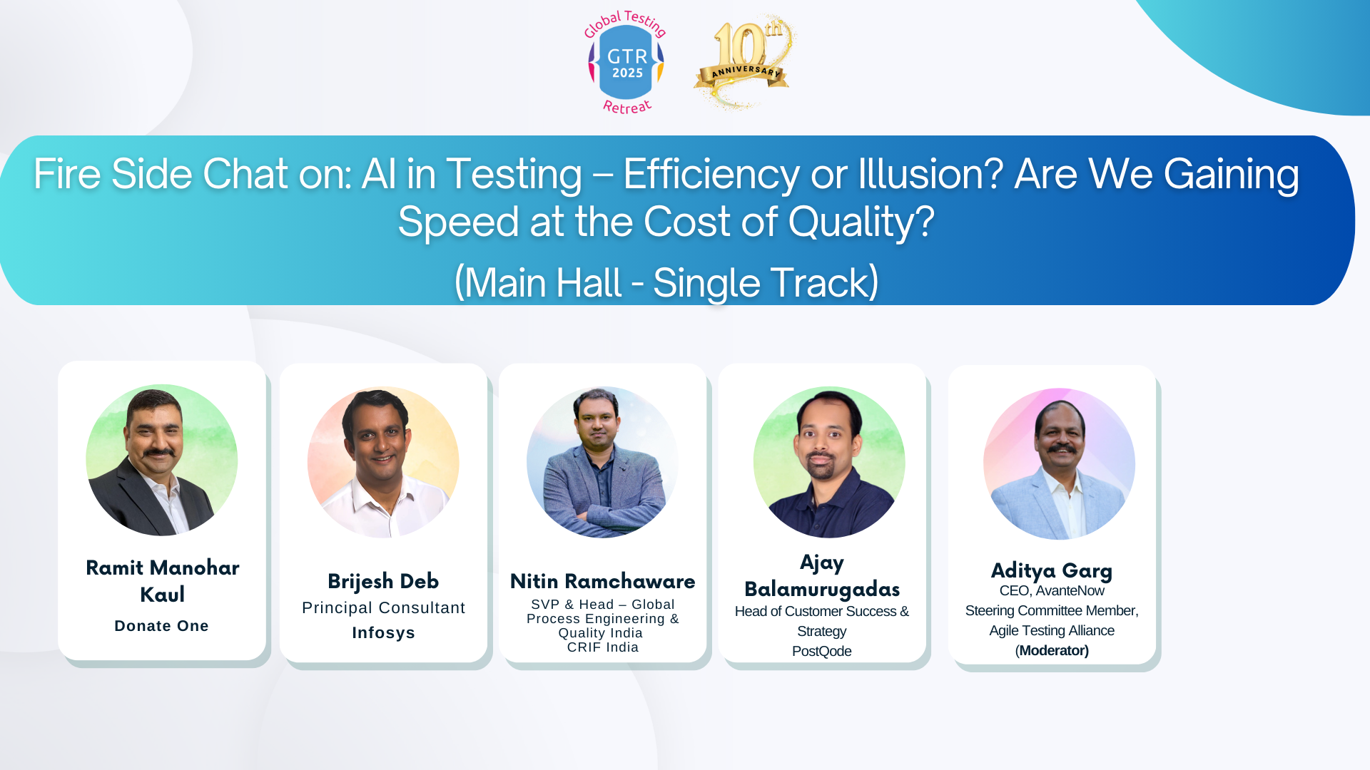 (6:30 PM - 7:25 PM) Fire Side Chat on :AI in Testing – Efficiency or Illusion? Are We Gaining Speed at the Cost of Quality?