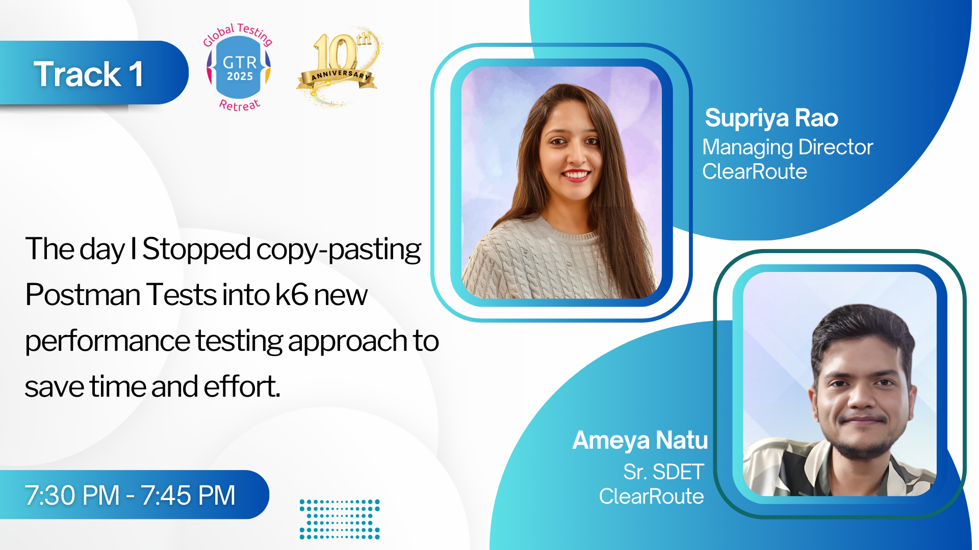 (7:30 PM - 7:45 PM) The day I Stopped copy-pasting Postman Tests into k6 new performance testing approach to save time and effort by Supriya Rao and Ameya Natu